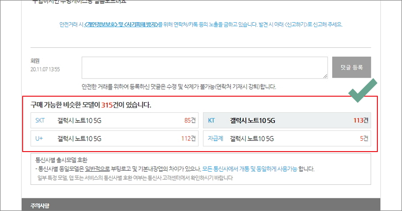 ▼ 선택한 매물에 대한 정보 아래에는 현재 파는 중고 휴대폰 중에서 비슷한 모델이 나타납니다. 이를 통해 여러 매물을 이곳저곳에서 알아보는 것이 좋습니다.