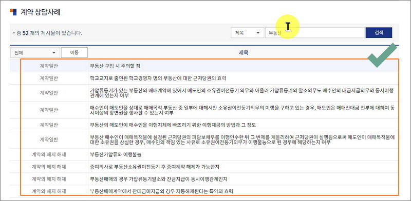 ▼ 최근 많은 사람들이 관심을 갖는 부동산을 검색해 보았습니다. 질문 제목에 "부동산"이 들어가는 상담사례가 52건을 찾았습니다. 제목을 보고, 경기도 센터에서 무료로 상담을 받으려고 했던 내용과 비슷한 것을 클릭합니다.