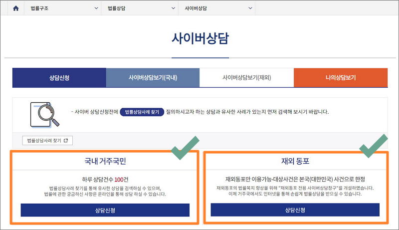 ▼ 법률구조공단 사이트에서 사이버상담 신청을 할 수 있습니다. 하루에 상담건수가 100건으로 제한이 되어 있다는 점을 숙지해 주시길 바랍니다.