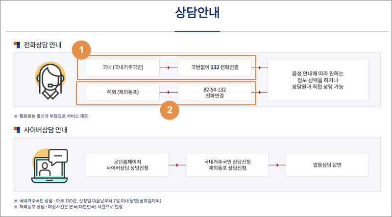 ▼ 국내 거주하는 국민이라면 국번 없이 132로 전화를 하면 법률상담을 받을 수 있습니다. 참고로 통화료는 발신자 부담입니다. 통화료가 부담이 되는 경우에는 사이버상담 서비스를 이용하는 것도 좋습니다. 오히려 질문 내용을 정리할 수 있는 시간이 충분히 주어지기 때문에 조리 있게 문의하기 좋습니다.