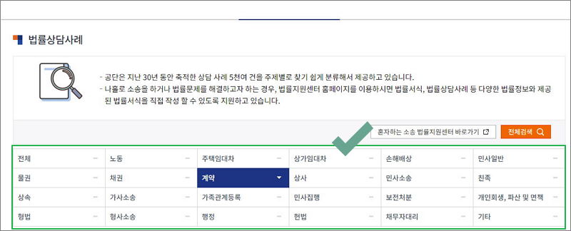 ▼ 5천개의 30년 동안 상담센터에서 축적한 사례는 주제에 따라 분류가 되고 있습니다. 노동, 채권, 물권, 상속, 형법, 헌법, 민사집행, 손해배상 등으로 20가지 이상으로 분류가 되어 있습니다. 개인적으로 검색 기능을 이용하는 것이 빠르다고 생각합니다.