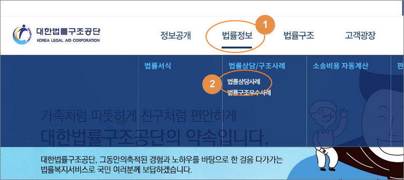 ▼ 대한법률구조공단 홈페이지에 접속했습니다. 메인화면에 있는 메뉴에서 "법률정보"를 클릭합니다. 그럼 지금까지 진행된 법률상담으로 만들어진 사례를 살펴볼 수 있는 서비스 메뉴를 찾을 수 있습니다.