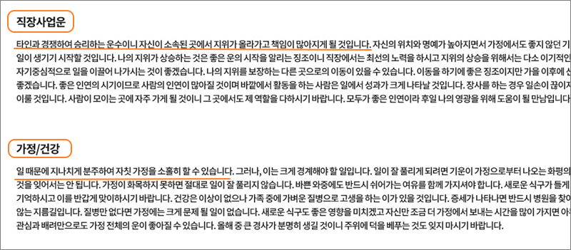 ▼ 전체적인 나의 삶에 대한 운을 알아볼 수 있는 총론을 살펴보겠습니다. 주의해야 할 것, 인생에서 맞이하게 되는 좋은 운, 운에 도움되는 자세나 행동 등을 알려줍니다. 총론을 통해 나의 운에 대한 전체적인 윤곽을 살펴본 후 재물운 등의 운세를 통해 각 부분에 대해 개별적으로 알아보면 됩니다.