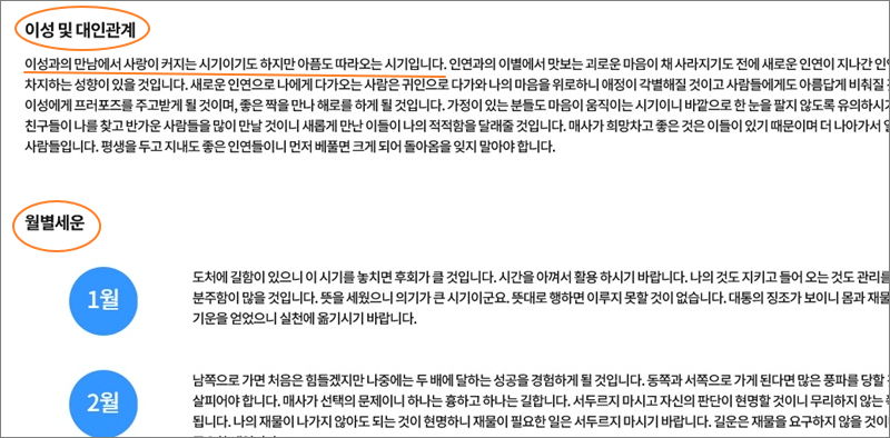 ▼ 사람은 혼자서는 살아갈 수 없는 존재입니다. 운세를 통해 이성과 대인관계에 관련된 운도 확인이 가능합니다. 생년월일 사주를 통해 월별 운세도 알아볼 수 있습니다. 월마다 어떤 일이 생길지 궁금할 때 보면 재미 있습니다.