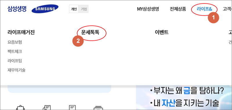 ▼ 삼성생명 사이트에서 무료 사주 운세를 보는 방법을 알려드리겠습니다. 회원가입을 할 필요 없이 바로 이용할 수 있는 서비스입니다. 메뉴에서 "라이프&"과 "운세톡톡"을 차례대로 클릭하면 여러 운세 서비스를 만나볼 수 있습니다.