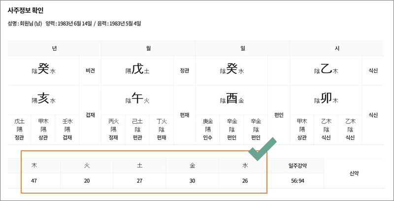 ▼ 새롭게 열린 페이지에서 가장 먼저 보이는 것은 사주명식과 오행입니다. 생년월일을 기반으로 만들어진 것으로 사주에 관해 공부를 한 사람이 직접 해석을 할 때 사용하면 좋습니다. 사주풀이에 대한 공부를 해본 적이 없는 경우에는 이 다음에 나오는 상세한 해석을 읽으면 됩니다.