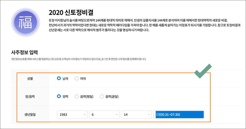 ▼ 2020 신토정비결은 조선 중기 학자인 토정 이지함 선생의 술서를 바탕으로 만들어 진 것입니다. 현대식 의미로 재해석되었기 때문에 요즘 사람들도 어려움 없이 사주풀이 결과를 이해할 수 있습니다. 그럼 토정비결을 보기 위해 성별, 생년월일, 양력 또는 음력 여부를 입력한 후 "운세보기" 버튼을 클릭합니다.