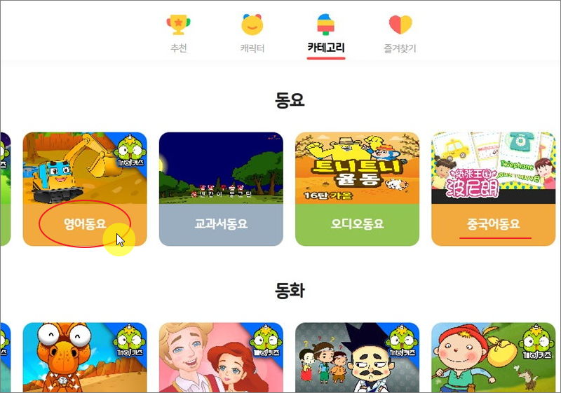 ▼ 여러 종류의 동요와 동화가 나타났습니다. 어린이들이 듣기 좋은 전래동요, 생활동요, 놀이동요 등이 보입니다. 영어로 된 동요를 찾는다면 리스트 맨 우측에 있는 화살표를 클릭해 봅시다.