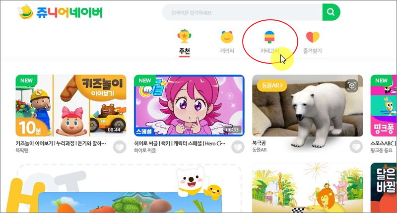 ▼ 쥬니어 네이버 사이트에 접속했습니다. 사이트에 처음 접속하면 여러 가지 컨텐츠를 추천 받을 수 있습니다. 어린이 전용 영어 동요듣기 원한다면 메뉴에서 "카테고리"를 클릭합니다.