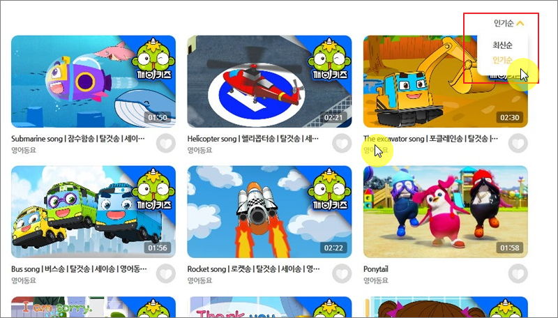 ▼ 곡이 너무 많기 때문에 어떤 것을 선택해야 할지 모를 수 있습니다. 많은 어린이가 좋아하는 곡을 쉽게 찾을 수 있습니다. 리스트 우측 상단에 있는 정렬 기능을 통해 인기순으로 영어동요 리스트의 순서를 정렬하면 됩니다. 그럼 가장 인기가 좋은 영어동요듣기를 손쉽게 할 수 있습니다.