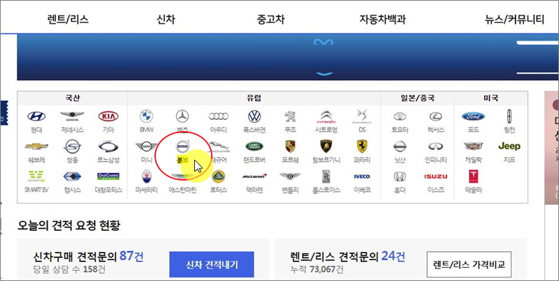 ▼ 다나와 자동차 사이트에 접속했습니다. 메인화면을 보면 여러 가지 제조사 이름과 마크가 나타납니다. 볼보 자동차의 경우 유럽 카테고리에서 쉽게 찾을 수 있습니다. 보시는 바와 같이 볼보 외에도 아우디, 벤츠, BMW 등 여러 수입차에 대한 가격표 확인도 가능합니다.