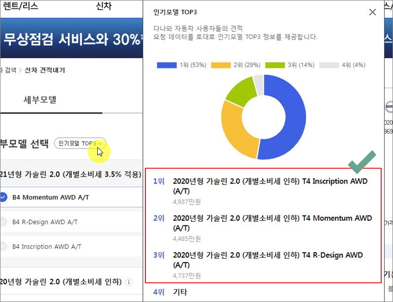 ▼ 세부 모델 중에서 어떤 것이 가장 인기 있는지 알고 싶다면 "인기모델 TOP3"를 클릭합니다. 그럼 견적 요청 데이터를 기반으로 만들어진 인기 순위를 확인할 수 있습니다.