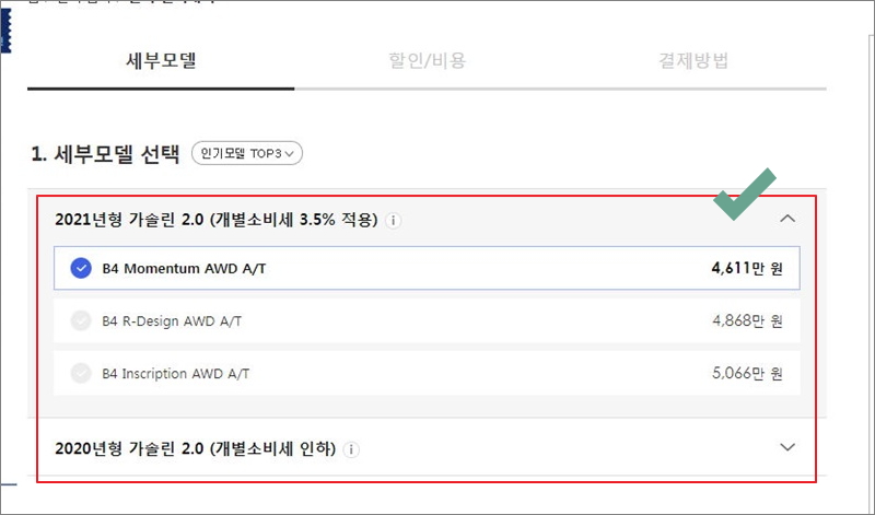 ▼ 다나와 자동차의 견적 시스템을 이용하면 본인이 원하는 세부모델, 옵션, 판매조건 등의 조건에 맞는 차량을 구매할 때 얼마의 비용이 발생하는지 정확하게 알 수 있습니다. 그럼 가장 먼저 세부모델을 선택합니다. 세부 등급에 따른 가격표가 나와 있으니 이를 감안하여 결정하면 됩니다.