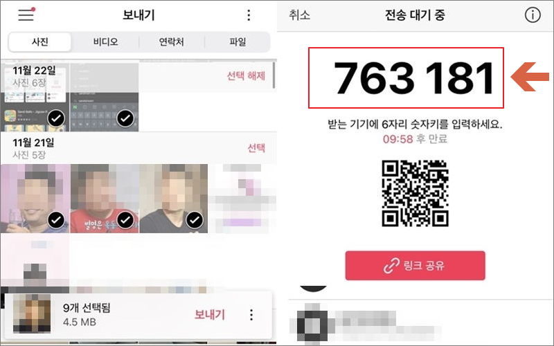 ▼ 보내고 싶은 사진을 선택합니다. 사진을 선택하면 아래에 "보내기" 버튼이 나타납니다. 해당 버튼을 클릭하면 6자리 숫자키를 얻을 수 있는데요. 여기에서 스마트폰을 만지지 말고, 컴퓨터를 켭니다.