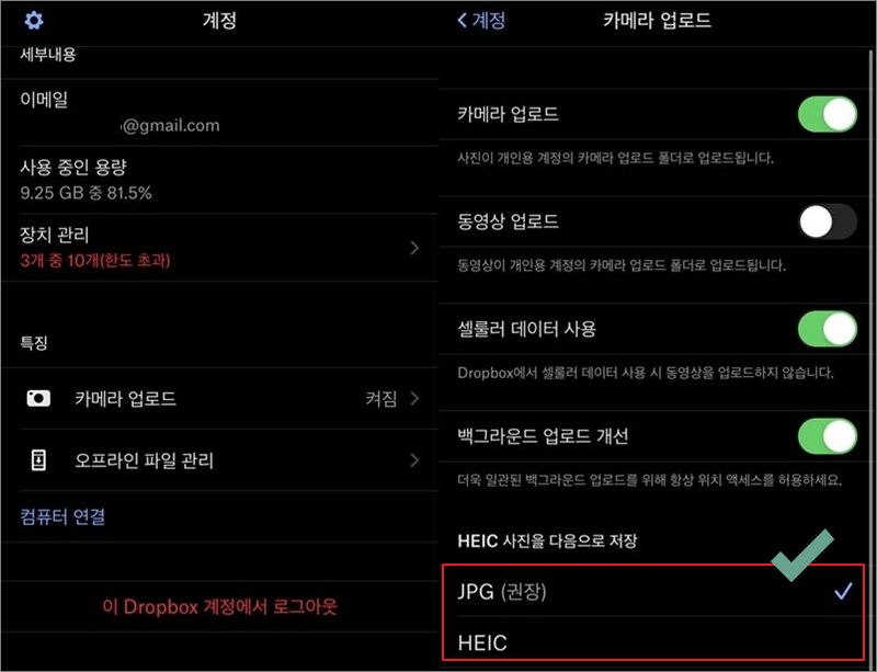 ▼ 카메라 업로드를 할 때에는 사진 뿐만 아니라 동영상도 업로드가 가능합니다. 사진 포맷을 JPG, HEIC 2가지 버전으로 백업할 수 있으니 마음에 드는 것을 선택하면 됩니다.