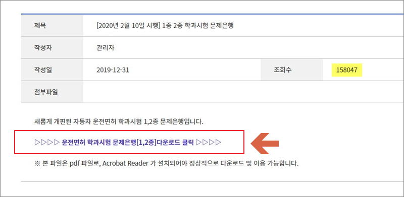 ▼ 가장 많은 사람들이 이용하는 1종 2종 학과시험 문제은행 게시물을 선택해 보았습니다. 15만회 이상 조회했을 정도로 많은 사람들이 이용한 자료입니다. 게시물 내용을 보면 운전면허 학과시험 문제은행 다운로드 버튼이 있습니다. 해당 버튼을 눌러 PDF 파일로 된 자료를 다운 받으면 됩니다.