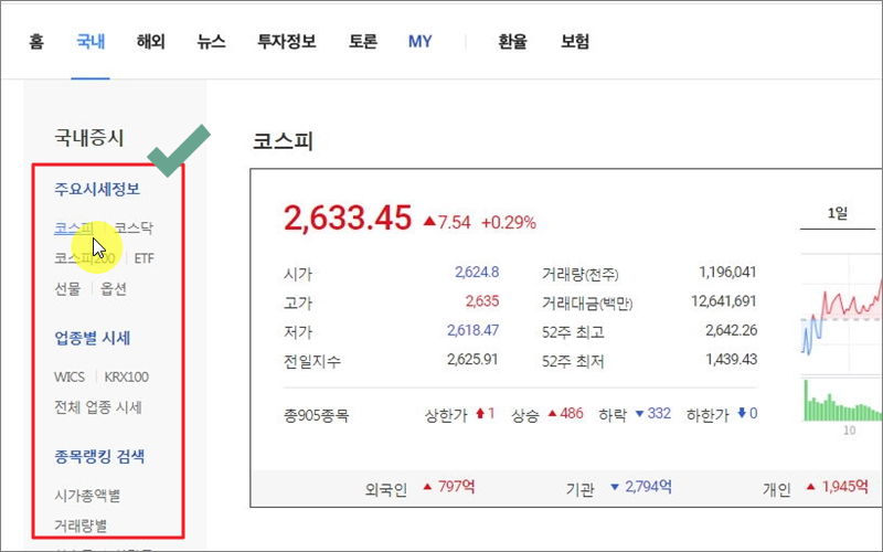 ▼ 많은 사람들이 이용하는 다음 사이트에서는 주식 관련 정보를 제공하고 있습니다. 특히 국내 주식시장 정보를 얻기 용이합니다. 코스피는 물론이고, 코스닥 종목시세를 알아보기에 안성맞춤이죠.