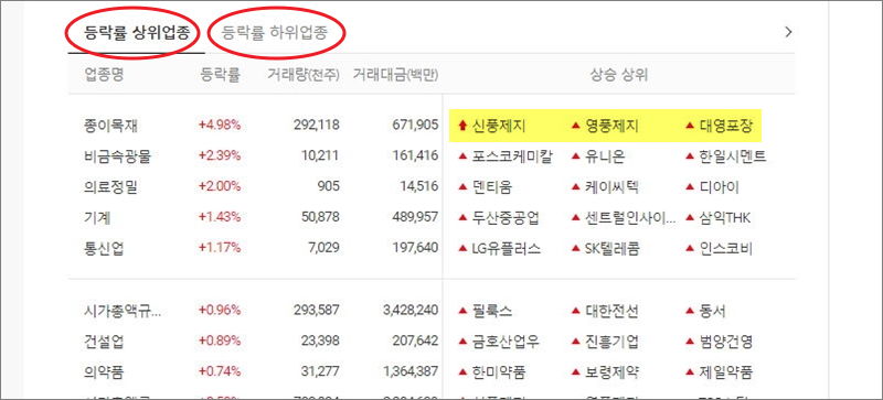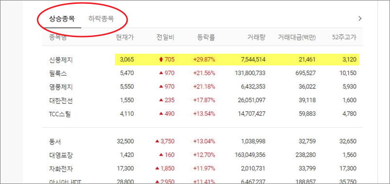 ▼ 종목시세가 상승했는지 또는 하락 했는지에 따른 리스트도 확인해 볼 수 있습니다. 최근 신풍제지, 필룩스, 영풍제지 등이 많이 상승했음을 알 수 있습니다.