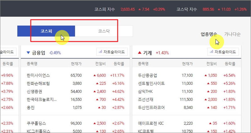 ▼ 쉽게 코스피 종목을 찾을 수 있는 "가나다순" 정렬을 이용할 수도 있습니다.