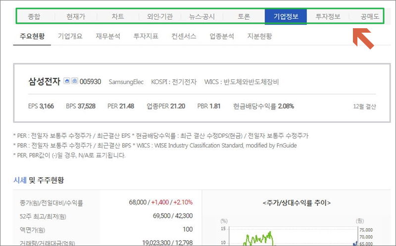 ▼ 개별 종목의 이름을 클릭해보면 시세를 포함한 여러 가지 정보를 얻을 수 있습니다. 차트, 외인과 기관의 매매 현황, 뉴스, 공시, 토론, 기업정보, 투자정보 등 얻을 수 있는 정보가 많습니다.