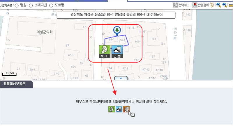 ▼ 확대한 상태에서 "부동산 선택" 버튼을 클릭합니다. 그럼 토지, 건물, 집합건물 아이콘이 나타납니다. 등기부등본이 필요한 부동산 종류를 클릭하여 아래쪽으로 끌어 놓으면 됩니다.