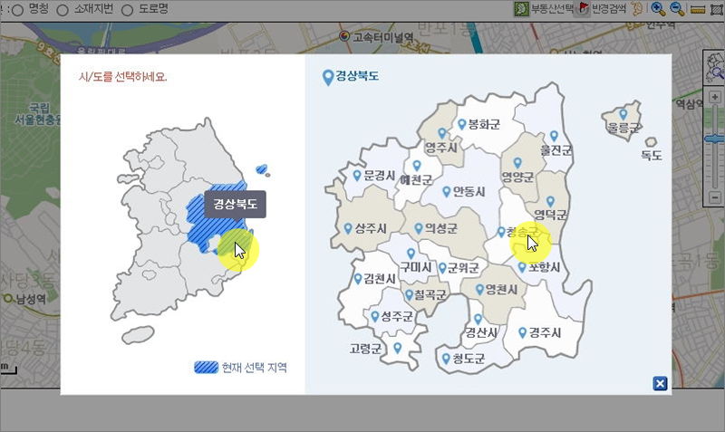 ▼ 저는 부동산 위치를 지도로 찾는 방법을 선택했습니다. 지도 화면이 나오면 지역을 선택합니다.