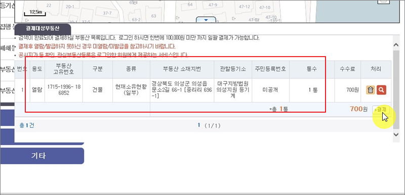 ▼ 마지막으로 우리가 열람하고자 하는 부동산 등기부등본에 대한 사항이 나타납니다. 여기서 "결제" 버튼을 누르면 수수료를 지불할 수 있습니다. 결제가 완료되면 안내에 따라 등기부등본을 열람할 수 있습니다.