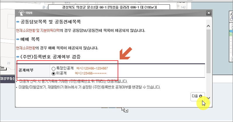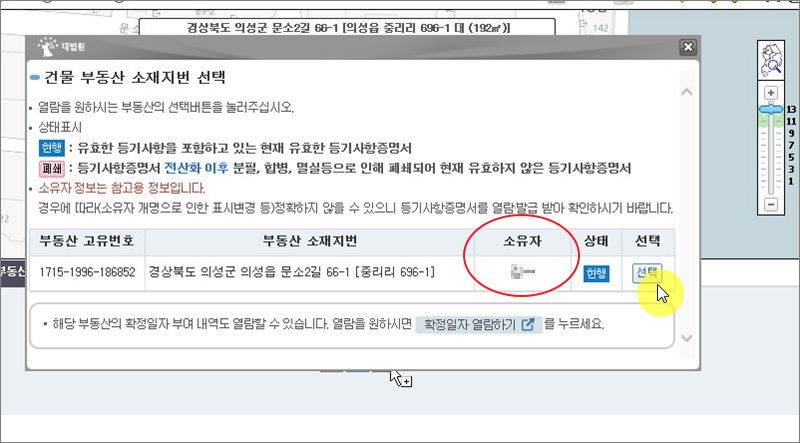 ▼ 건물 부동산 소재지번 선택 부분에서 우리는 수수료 없이 일부 정보를 열람할 수 있습니다. 부동산 고유번호와 소유자의 성씨입니다.
