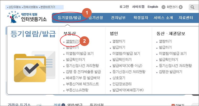 ▼ 인터넷등기소 홈페이지에 접속했습니다. 메뉴에서 "등기열람/발급"을 클릭합니다. 그럼 부동산, 법인, 동산, 채권담보 카테고리가 나옵니다. 각 물건에 대하여 등기부등본 열람은 물론이고, 발급, 발급확인, 처리현황 확인, 발급 예약, 소유현황 확인 등이 가능합니다. 이번 시간에 알려드리는 방법은 부동산 카테고리에 있는 "열람하기"를 클릭하여 진행하겠습니다.