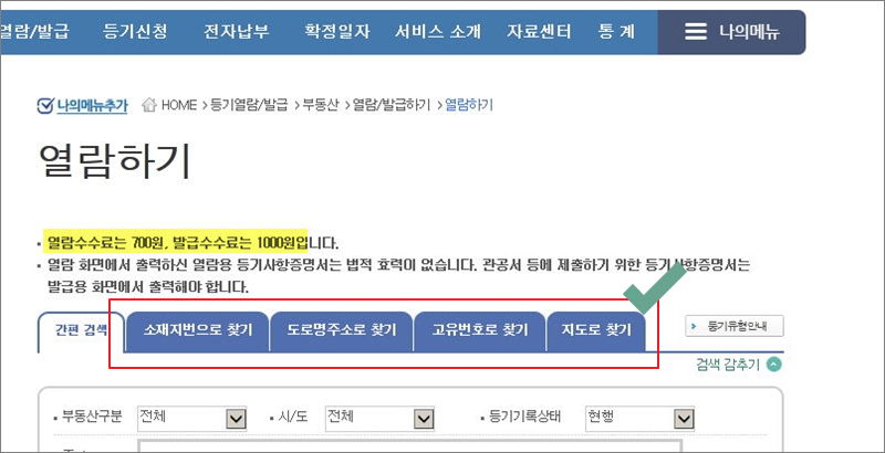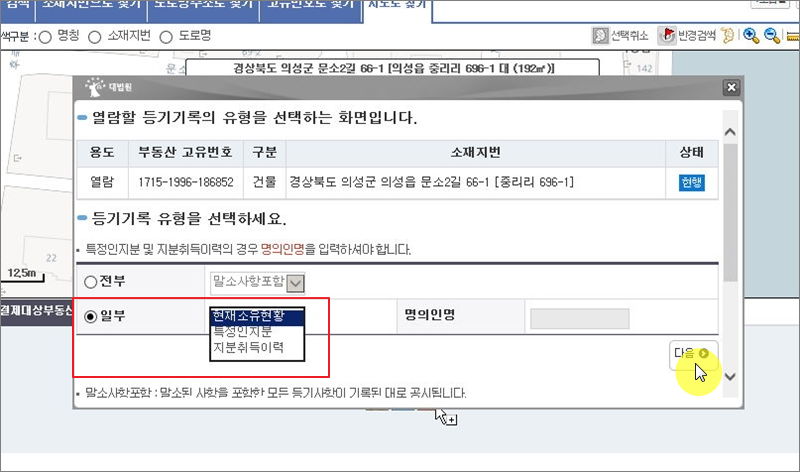 ▼ 우리가 선택한 부동산에 대한 상세 주소를 담고 있는 페이지가 열립니다. 이곳에서 열람 용도를 선택합니다.
