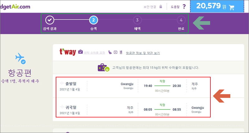 예약 업체 중 한 곳을 선택하면 이렇게 항공권 예약을 진행할 수 있는 사이트가 열려요. 이곳에서 예약을 진행할 광주 제주 항공권에 대한 정보를 꼼꼼히 확인해 주세요. 그다음부터는 승객 정보, 혜택 선택, 결제를 진행하면 비행기표 예약을 완료할 수 있어요.