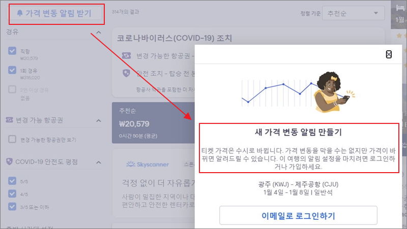 원하는 광주 제주 항공권을 찾았지만, 가격이 마음에 들지 않을 수 있어요. 이런 경우에는 메일을 통해 가격 변동에 대한 알림을 받을 수 있어요. 여객기 티켓 특성상 가격이 수시로 변하기 때문에 해당 기능이 유용해요.