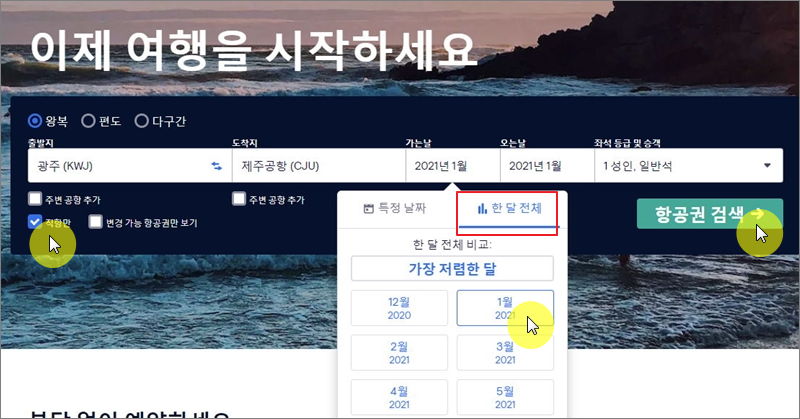 스카이스캐너 사이트에 접속했어요. 일단 출발지는 광주, 도착지는 제주를 입력해 주세요. 가는날과 오는날은 비행기에 탑승을 할 날짜를 입력하는 부분인데요. 이 부분에서 저렴하게 제주 항공권 예약을 하고 싶다면 [한 달 전체]를 클릭해 주세요. 이렇게 하면 해당 월 중에서 가장 티켓 요금이 저렴한 날짜가 언제인지 알 수 있어요.