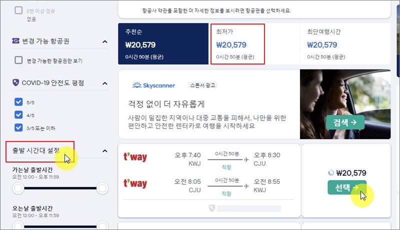 날짜를 선택하면 이번에는 출발 시간대와 함께 항공편을 결정할 차례에요. 대부분의 사람들이 많이 찾는 출발 시간대에는 광주 제주 항공권 요금이 비싼 편이에요. 저렴하게 예약을 진행하고 싶다면 좀 이른 시간이나 늦은 시각에 탑승하는 항공권을 예약하면 돼요.
