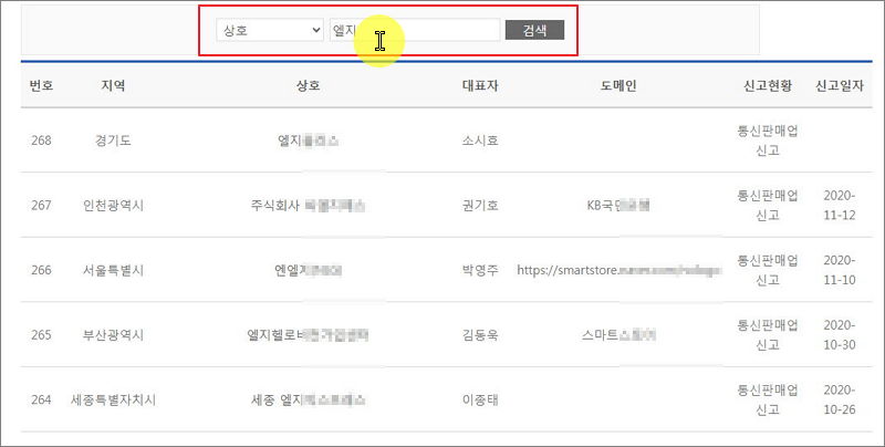 저는 상호에 "엘지"라는 단어가 포함된 사업자를 검색해 보았습니다. 간단한 표를 통해 지역, 상호, 대표자, 도메인, 신고현황, 신고일자가 나타나나는데요. 본인이 알아보고자 한 사업자가 있다면 마우스로 클릭을 해주시길 바랍니다. 그럼 사업자등록번호 확인은 물론이고, 더 많은 정보를 확인할 수 있습니다.