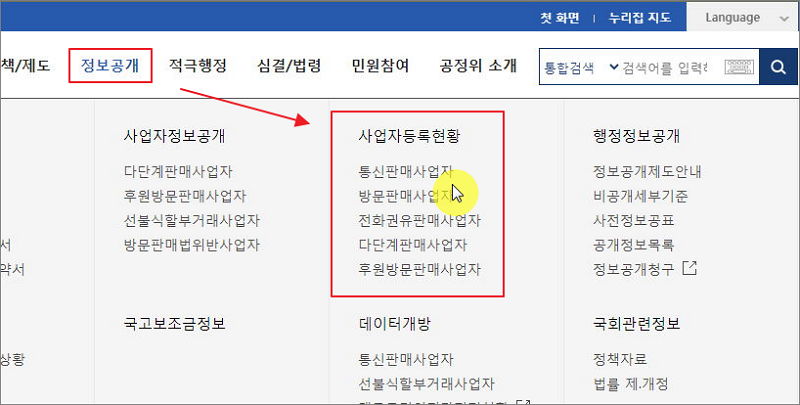 정보공개 메뉴를 클릭해 보면 사업자정보공개, 사업자등록현황, 행정정보공개, 국회관련정보, 데이터개방, 국고보조금정보 등의 카테고리가 나타나는데요. 여기에서 사업자등록현황에 있는 서비스 메뉴를 선택하면 됩니다. 보시면 아시겠지만, 통신, 방문, 전화권유, 다단계, 후원방문을 통한 판매사업자 한해서 확인이 가능합니다.