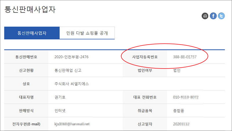 상호를 클릭하면 표로 잘 정리가 된 사업자에 대한 정보가 조회됩니다. 통신판매번호, 신고현황, 법인여부, 취급품목, 판매방식, 대표자명, 전자우편번호, 전화번호 등 다양하게 알아볼 수 있습니다. 표에서 우측 상단을 보면 사업자등록번호도 나타나고 있음을 알 수 있습니다.