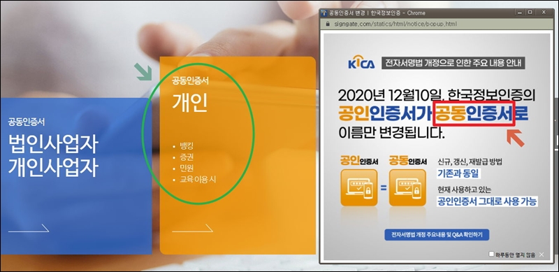한국정보인증 사이트에 접속했어요. 처음 화면을 보면 개인용, 사업자용 공동인증서를 선택하는 부분이 나와요. 개인적인 용도로 뱅킹, 증권, 민원, 교육관련 서비스를 이용하기 위해 인증서가 필요한 것이라면 "개인"을 선택하면 돼요. 사업용으로 사용하기 위해서는 사업자용을 선택하면 되고요. 앞서 언급한 바와 같이 2020년 12월 10일부터 공인인증서가 공동인증서로 이름이 변경되었어요. 갱신, 재발급, 신규 발급방법이 기존과 동일하다고 해요. 현재 공인인증서를 사용하고 있는 분들은 그대로 사용할 수 있고요.