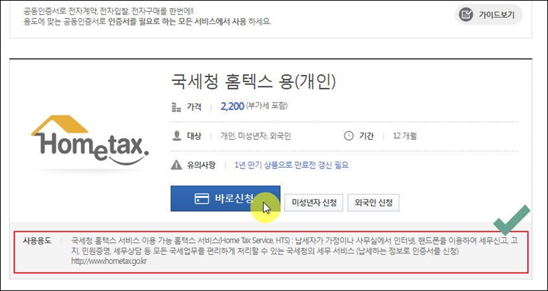 국세청용 공동인증서의 사용용도를 보시면 여러 가지 세금 관련 일을 할 수 있다고 되어 있어요. 일단 어떤 공동인증서를 신규로 신청하든 발급방법은 동일한데요. 이번 시간에는 국세청용을 중심으로 발급방법을 알려드릴게요. 범용 공인인증서도 동일한 방법으로 발급 진행이 가능해요. 그럼 "바로 신청" 버튼을 눌러 신규 발급을 진행해 볼게요.