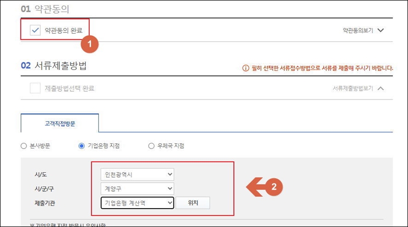 신청하는 방법은 총 4단계로 진행이 돼요. 일단 약관을 동의하고, 서류를 제출할 방법을 선택해야 해요. 서류 제출을 위해 가까운 우체국이나 기업은행 지점을 방문해야 하는데요. 해당 위치를 입력해 주세요.