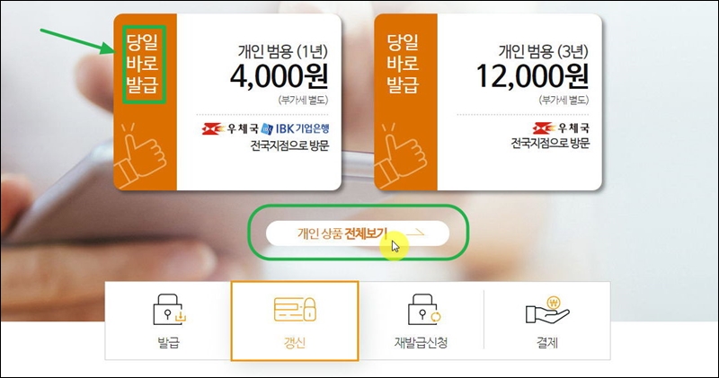 앞서 한국정보인증 사이트를 이용하면 당일 신청하고, 바로 발급을 받을 수 있다고 말씀 드렸는데요. 메인화면에 해당 내용이 표시되어 있네요. 범용 공동인증서의 경우 대부분의 용도로 사용할 수 있기 때문에 좋지만, 수수료가 비싸다는 것이 흠이에요. 공동인증서 사용 용도가 많지 않은 경우에는 전용 상품을 살펴보세요. "개인 상품 전체보기" 버튼을 클릭하면 알아볼 수 있어요.