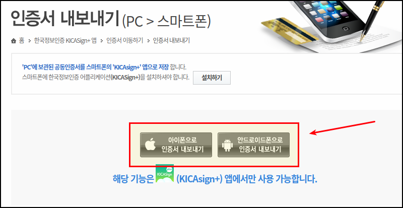 새롭게 열린 페이지를 통해 공인인증서를 핸드폰으로 내보낼 수 있는데요. 아이폰과 안드로이드폰 두가지 모두 가능해요. 본인이 사용하는 기종에 맞는 내보내기 버튼을 클릭한 후 안내에 따라 공인인증서 복사를 진행하면 돼요.