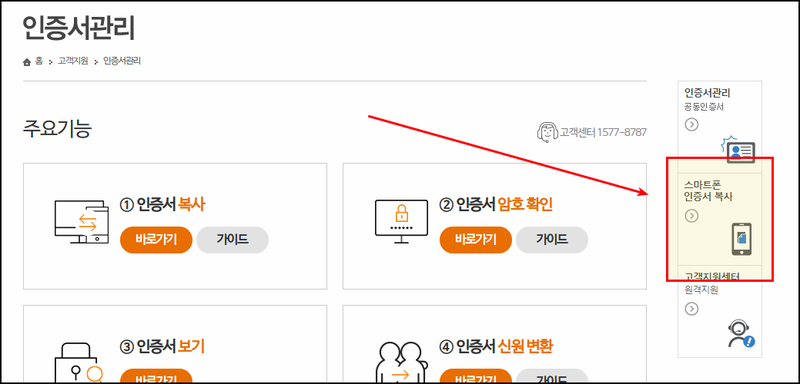 인증서 관리 페이지에서는 공인인증서 복사, 암호 확인, 신원 변환 등 다양한 기능을 제공하고 있는데요. 사이트 맨 우측에 보면 핸드폰 공인인증서 복사 메뉴가 있어요. 해당 메뉴 버튼을 클릭해 주세요.