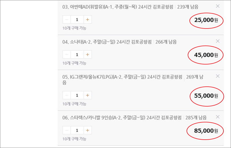판매글을 하나 선택해 보세요. 그럼 옵션 선택을 할 수 있도록 나와 있는데요. 가장 먼저 자동차 모델을 선택해야 해요. 사람들이 많이 타는 자동차 모델인 레이, 아반떼, 소나타, 그랜져, 스타렉스 등이 나오네요. 하루 동안 사용하고 싶은 자동차 모델을 클릭해 주세요.