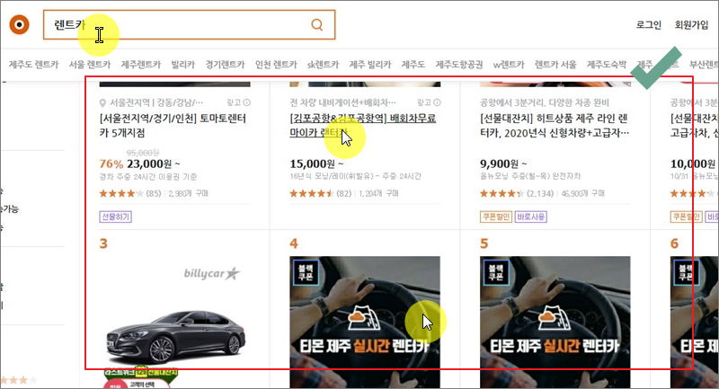 티몬 사이트에 접속해서 "렌트카"를 검색해 보세요. 그럼 여러 업체의 판매글을 확인할 수 있는데요. 검색 결과에 나오는 것은 가장 저렴한 자동차 모델에 대한 하루 렌트비용이기 때문에 가격 비교가 어려워요. 판매글을 클릭해서 들어가 봐야 전체적으로 렌트비용이 어떠한지 파악하는 데에 용이해요.