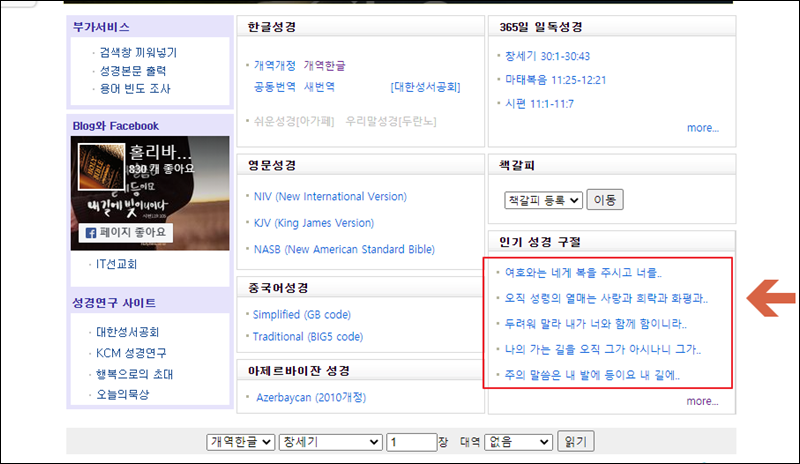 메인화면 하단에도 성경에 관한 많은 서비스를 제공하고 있는데요. 한글, 영어, 중국어, 아제르바이잔어로 된 성경을 읽을 수 있어요. 거기에 더하여 우리가 이번 시간에 이용할 인기 성경구절 서비스도 있습니다. 해당 영역 아래에 있는 more 버튼을 클릭해 볼게요.