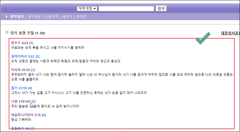 마음에 드는 성경구절 하나를 마우스로 클릭해 보세요. 그럼 해당 구절이 포함된 성경 내용을 살펴볼 수 있습니다.