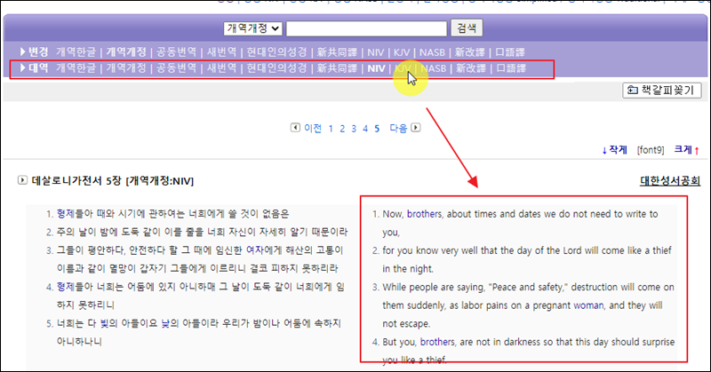 성경 내용에서 사이트 상단에 있는 대역 부분을 보면 NIV, KJV, NASB가 보이실 거에요. 이 중에서 하나를 클릭해 보세요. 그럼 좌측에는 한글로 된 성경 내용이 나오고, 우측에는 영어로 된 성경 내용이 나와요.