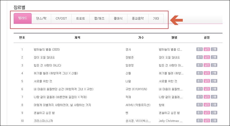 좋아하는 장르가 있다면 장르별 음원 리스트를 살펴보세요. 발라드, 댄스, 락, CF, OST, 트로트, 팝, 재즈, 클래식, 종교음악 등 여러 장르의 음원 중에서 인기 있는 음원을 살펴볼 수 있어요. 제가 지금까지 설명 드린 방법을 통해 쉽게 lg 컬러링을 이용할 수 있을 거에요. 그럼 좋은 곡으로 기분 좋은 하루 되세요.