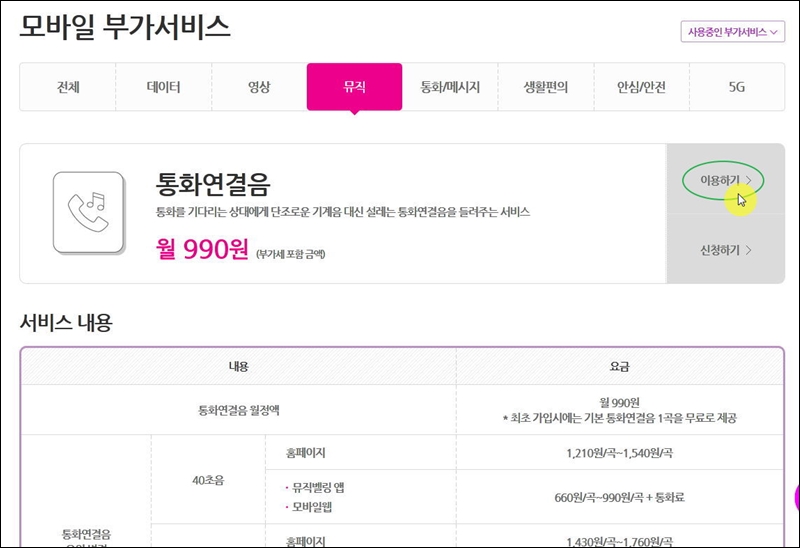 모바일 부가서비스 페이지가 열렸어요. 데이터, 영상, 뮤직, 통화, 메시지, 생활편의, 안심, 안전, 5G 등 꽤 많은 부가서비스들이 나타나는데요. 여기에서 간단하게 lg 컬러링 서비스를 찾는 방법을 알려드릴게요. 메뉴에서 "뮤직"을 클릭하면 여러 서비스가 나타나는데요. 여기서 화면을 쭉 아래로 내려주세요.